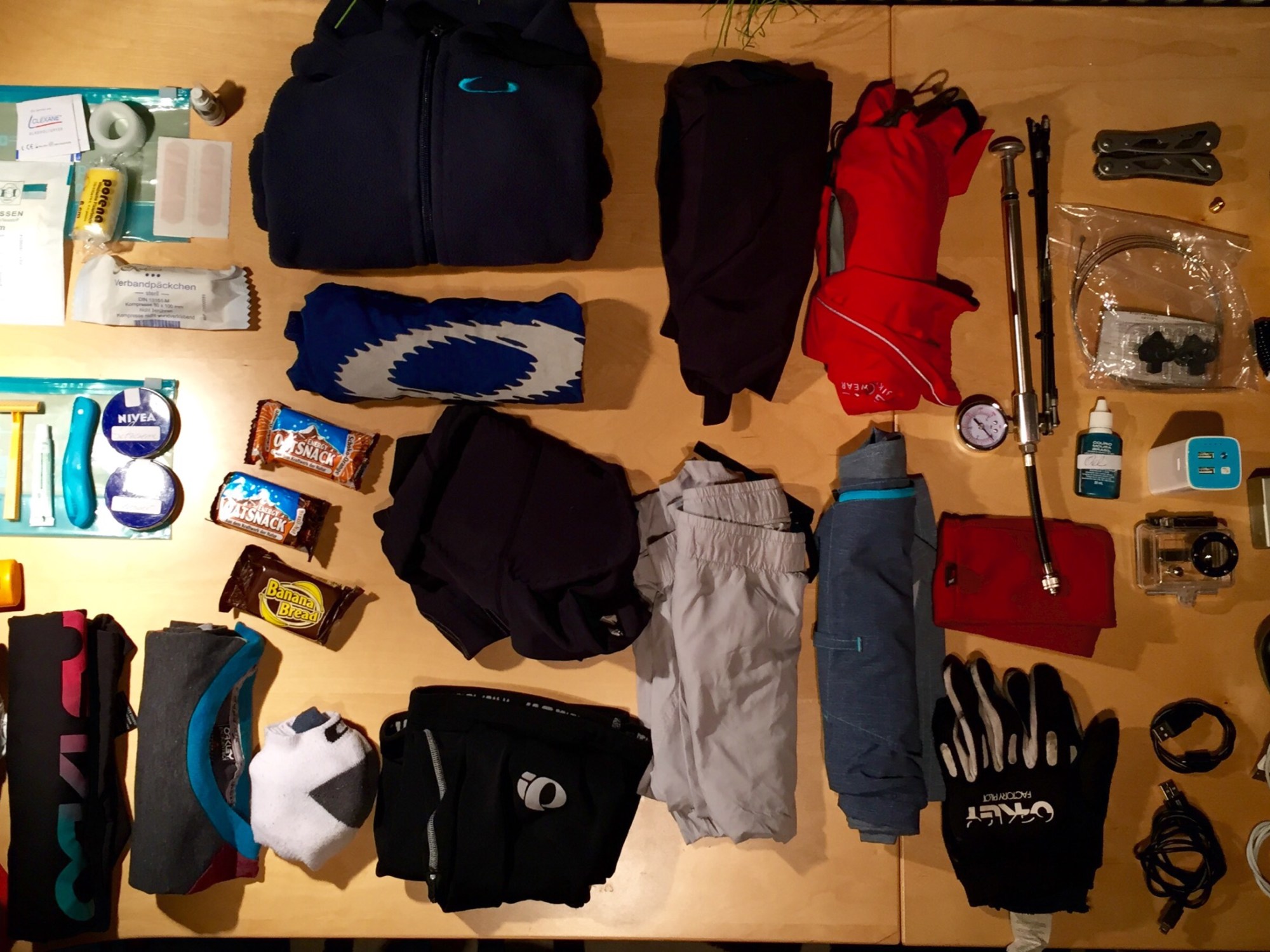 Das ist die Füllung meines Deuter Transalpine mit dem es am Donnerstagmorgen endlich losgeht. 6,5 kg, eigentlich etwas viel für eine ´schnelle´3 Tagestour mit dem Mountainbike über die Alpen. Aber ein wenig individueller Komfort und etwas Technik sind auch diesmal mit dabei.