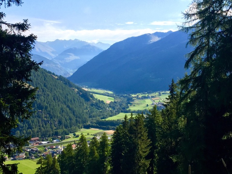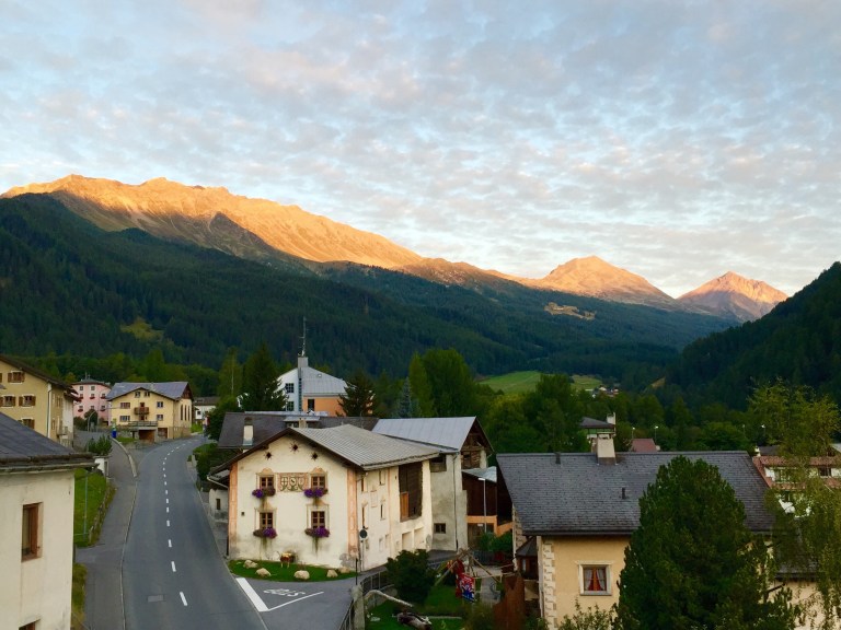 Das war auch gestern am 3. und finalen Tag unsere Weckzeit. Aufstehen, kurz durchschütteln, Körperflege und ordentlich frühstücken. Kennt man. Gut, der schon italienische Charme hier im Tal und auch im Hotel machts natürlich besonders. Und der fantastische Blick nach dem Aufstehen aus dem Fenster. Milde Luft, morgendliches Alpenglühen und viel blau. Siehe erstes Bild.