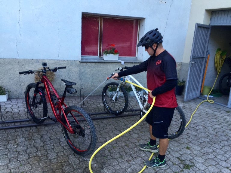 Diesmal gab es auch für unsere Bikes Pflege. Das war nötig, sie waren total verschlammt vom rustikalen Vortag. Das wilde Fimbertal hatte den Bikes ordentlich zugesetzt.