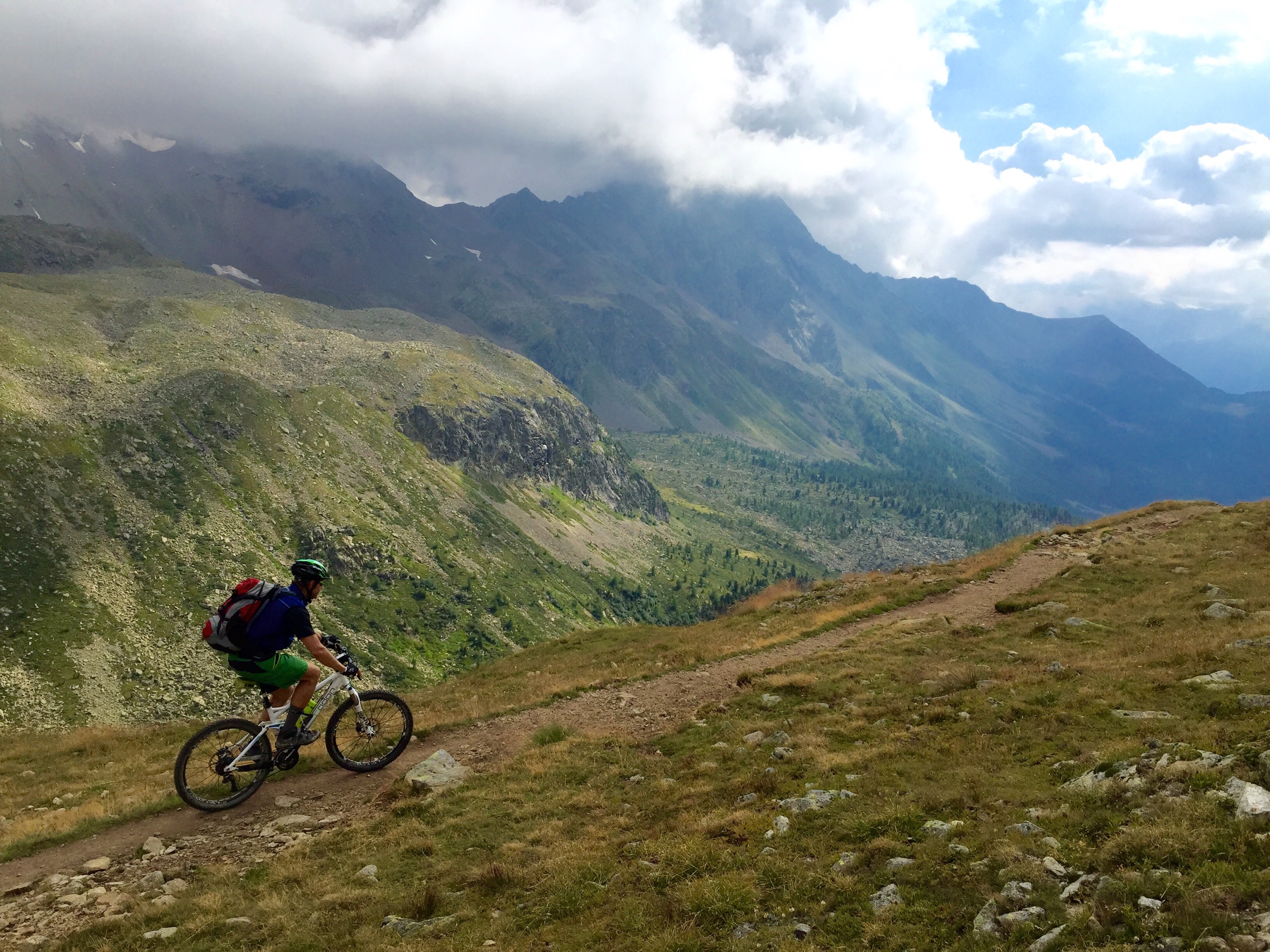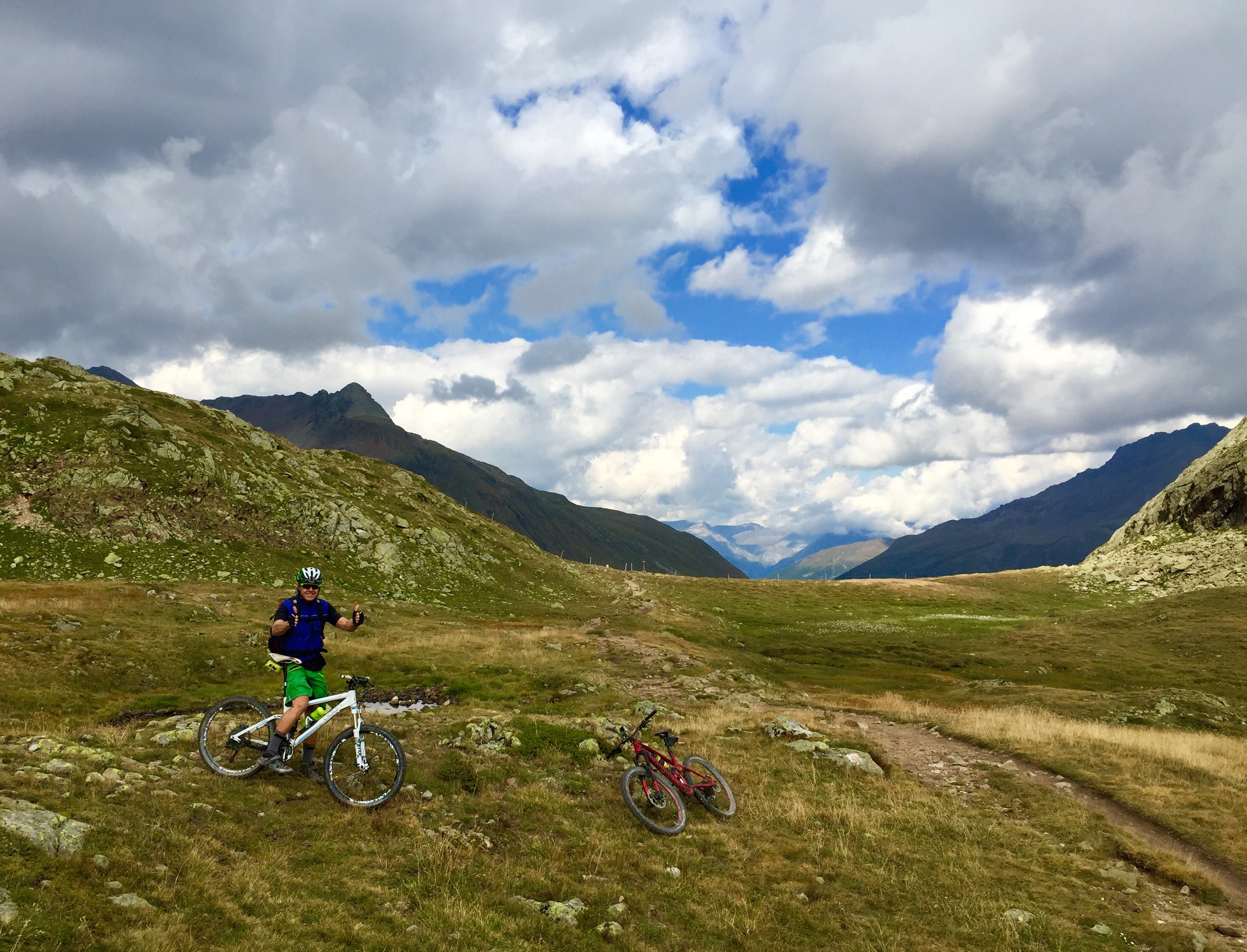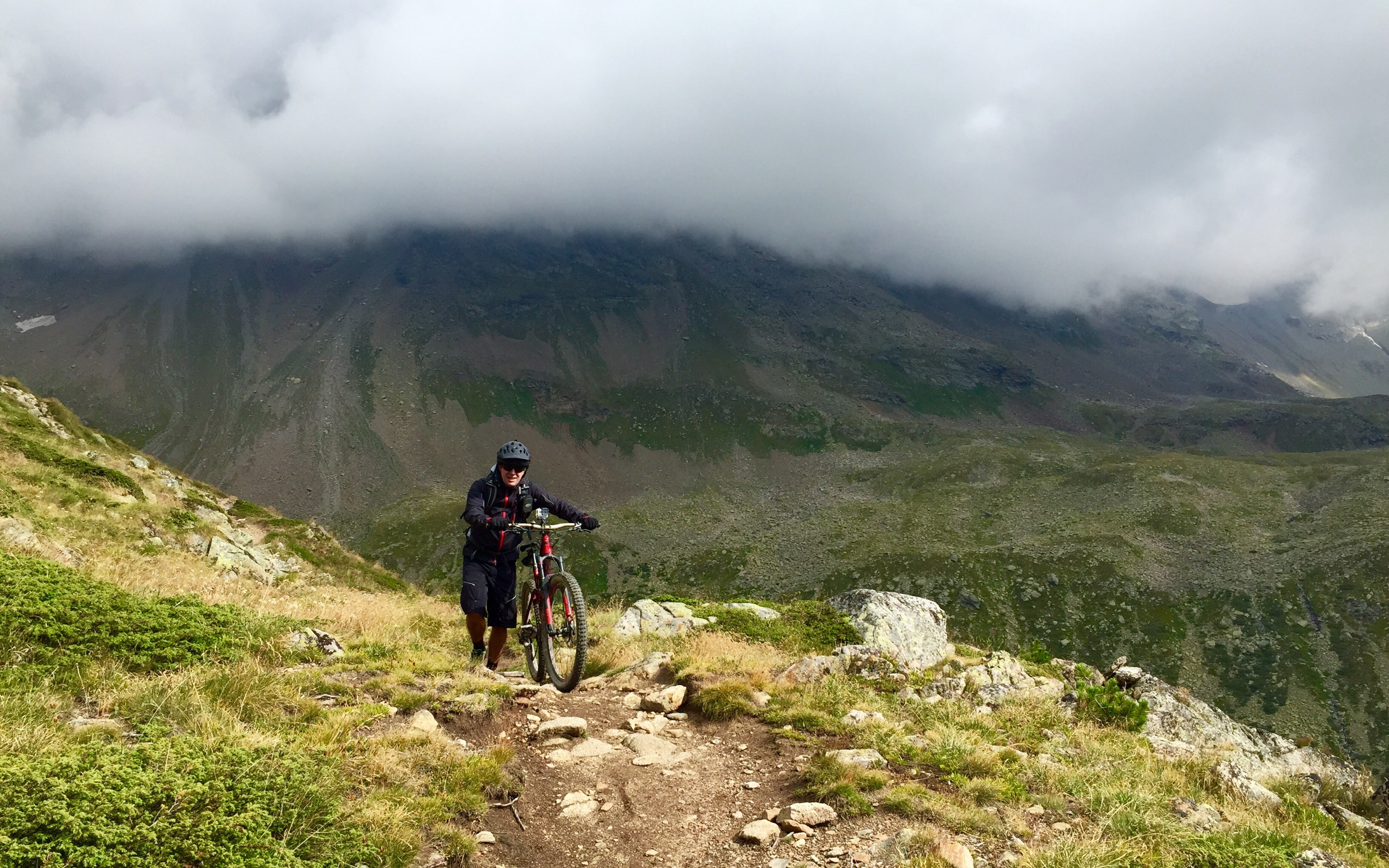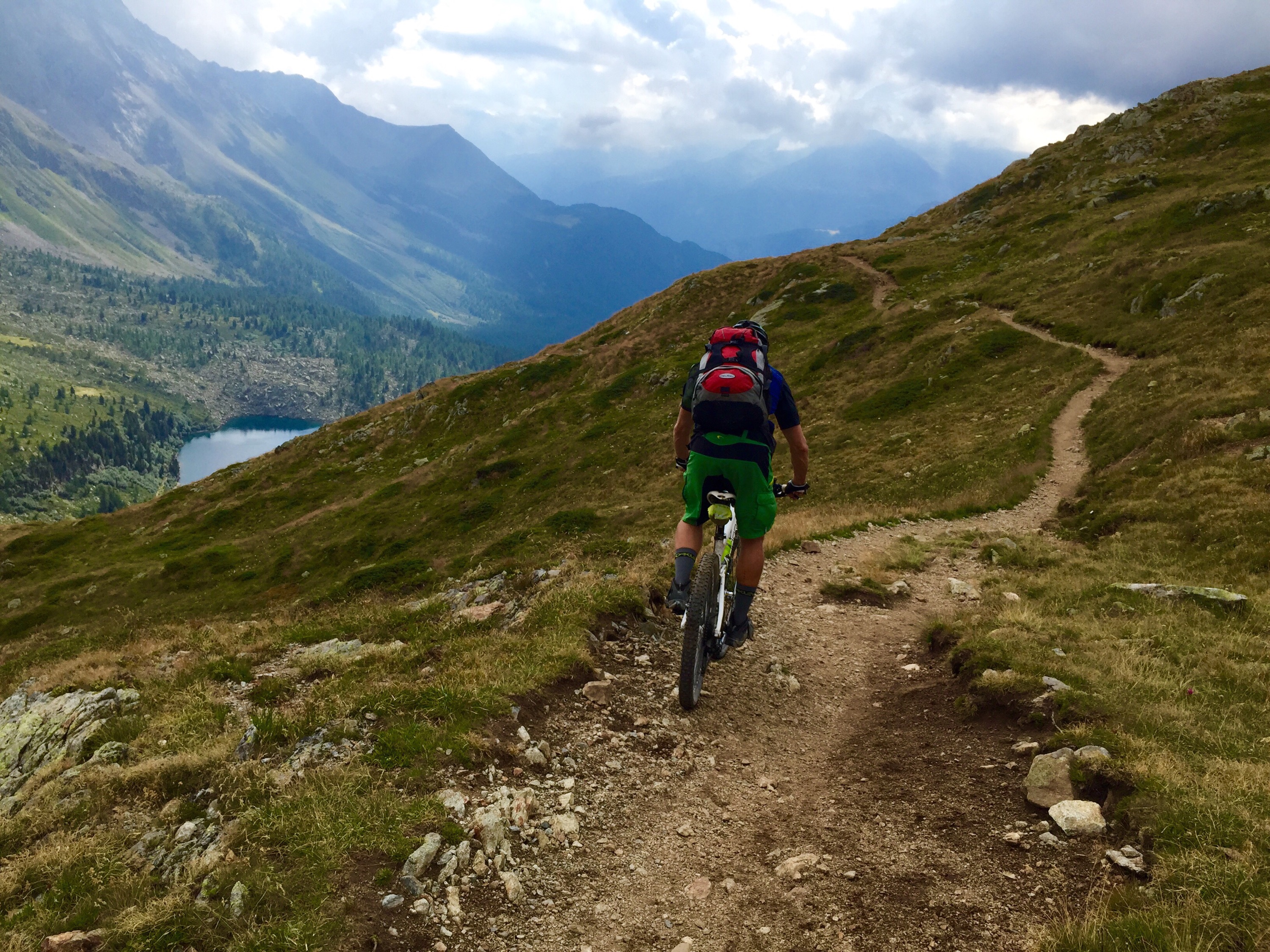 Jetzt mal keine direkte Abfahrt, sondern ein 45 minütiger steiler Abstieg durch die Flanke. Auch eine Erfahrung, besonders mit dem Rad. Dann endlich die rauschende Abfahrt nach Poschiavo unter drohender Wolkenkullisse, die sich aufgebaut hatte. Aber wir hatten weiter Glück und blieben trocken und konnten die unbeschreibliche ‚Achterbahnabfahrt‘ über Hochalmen in unseren Zielort genießen.