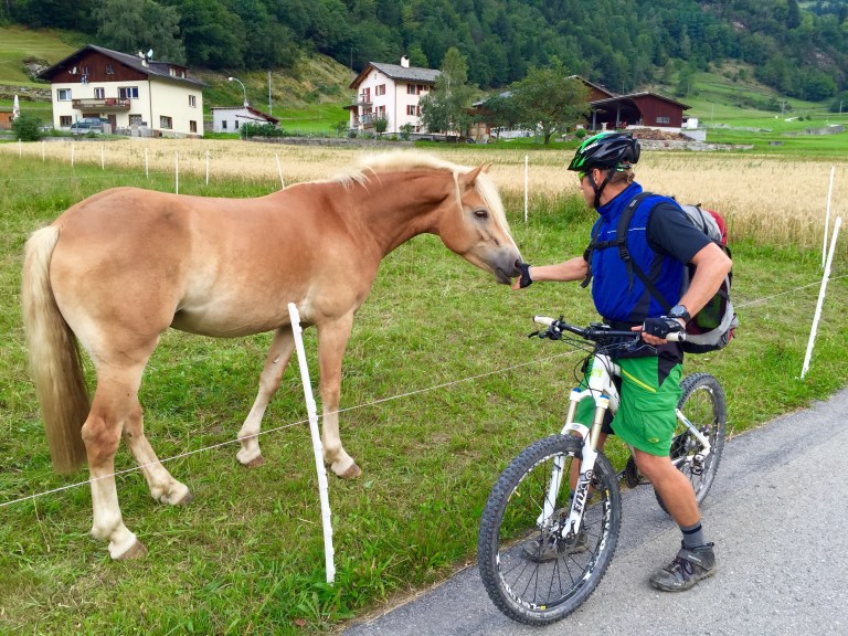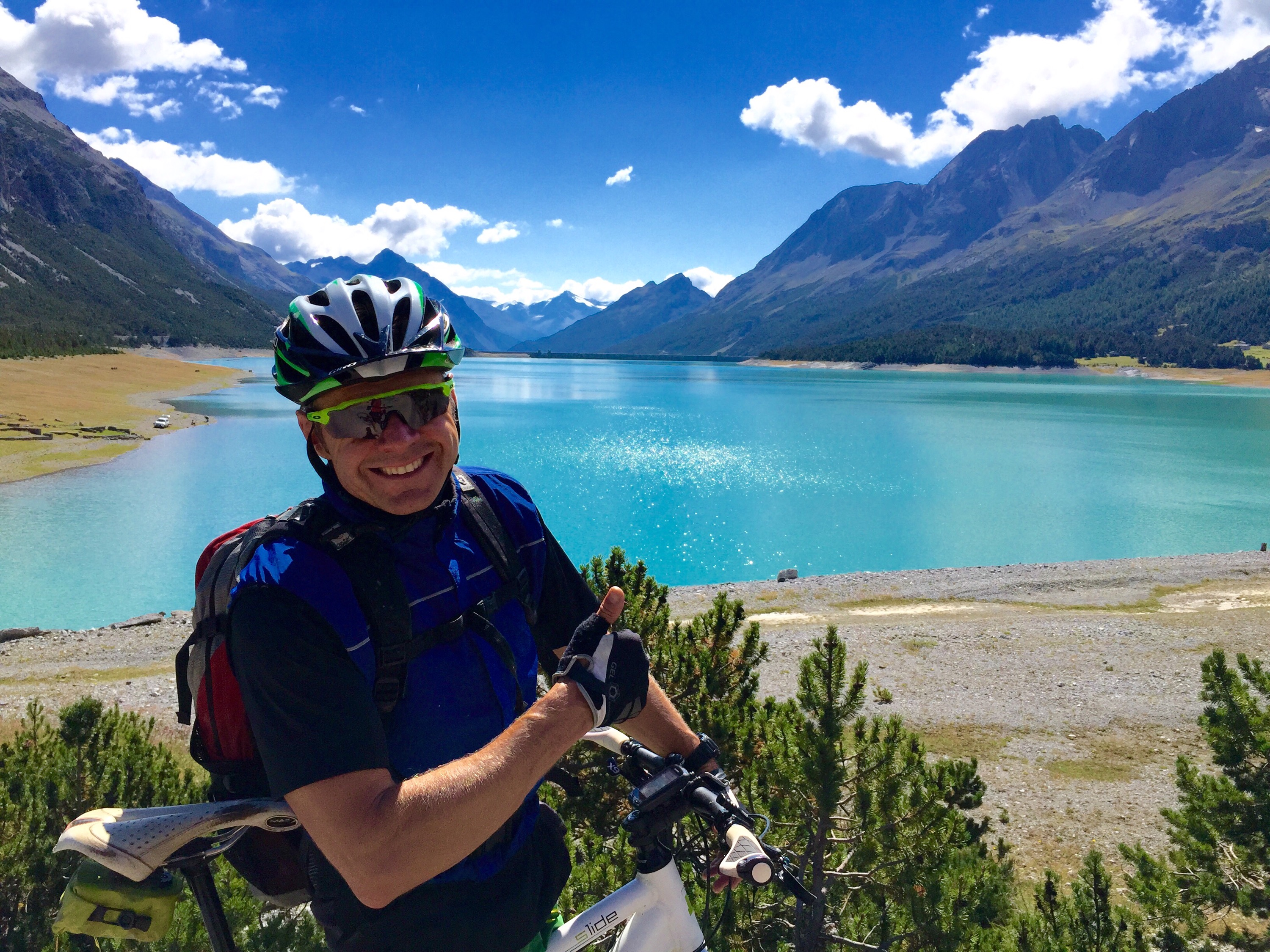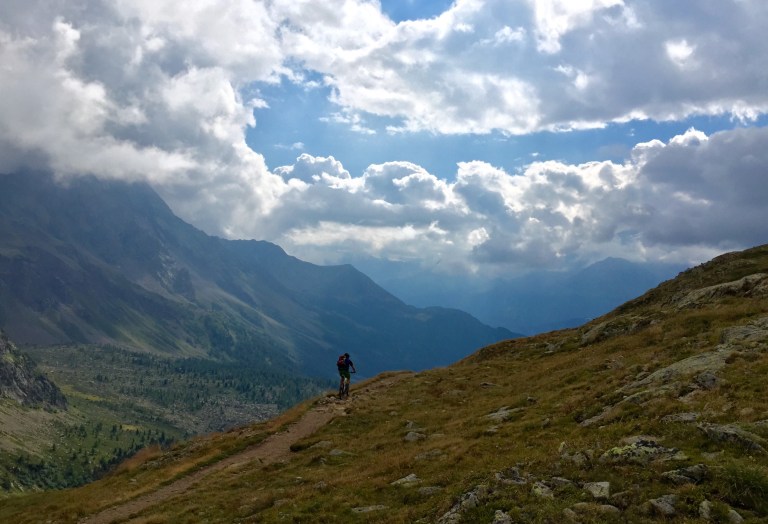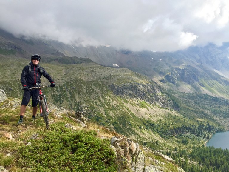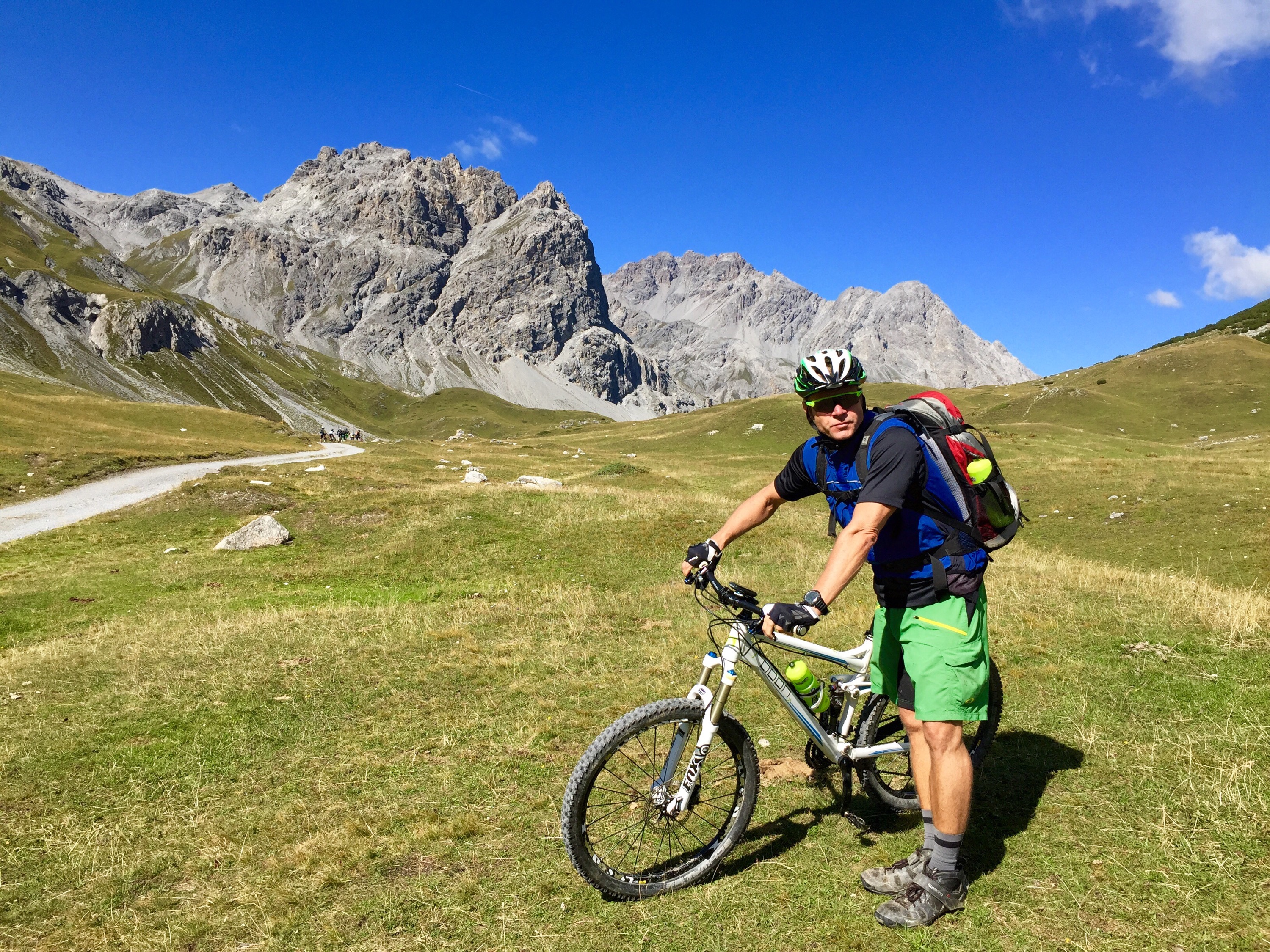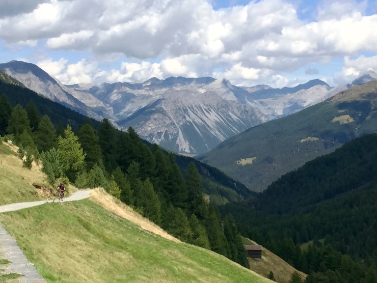 Jetzt mal keine direkte Abfahrt, sondern ein 45 minütiger steiler Abstieg durch die Flanke. Auch eine Erfahrung, besonders mit dem Rad. Dann endlich die rauschende Abfahrt nach Poschiavo unter drohender Wolkenkullisse, die sich aufgebaut hatte. Aber wir hatten weiter Glück und blieben trocken und konnten die unbeschreibliche ‚Achterbahnabfahrt‘ über Hochalmen in unseren Zielort genießen.