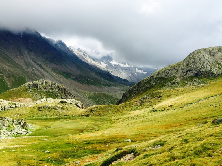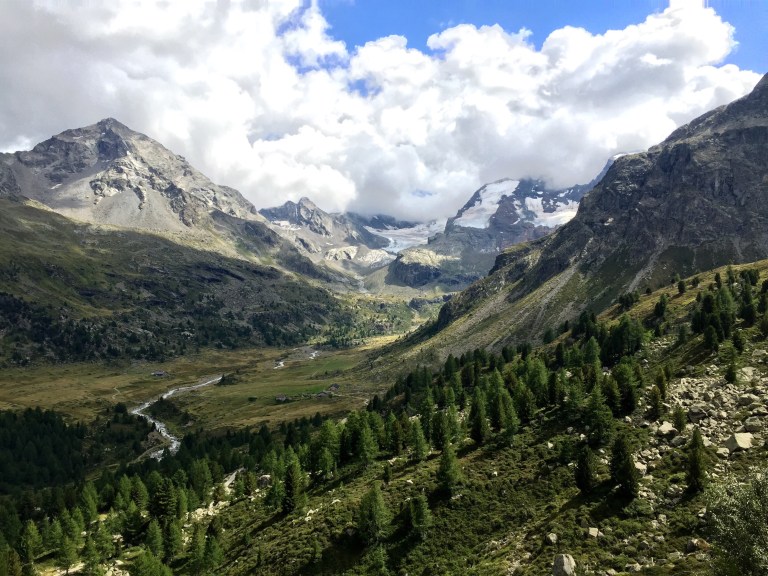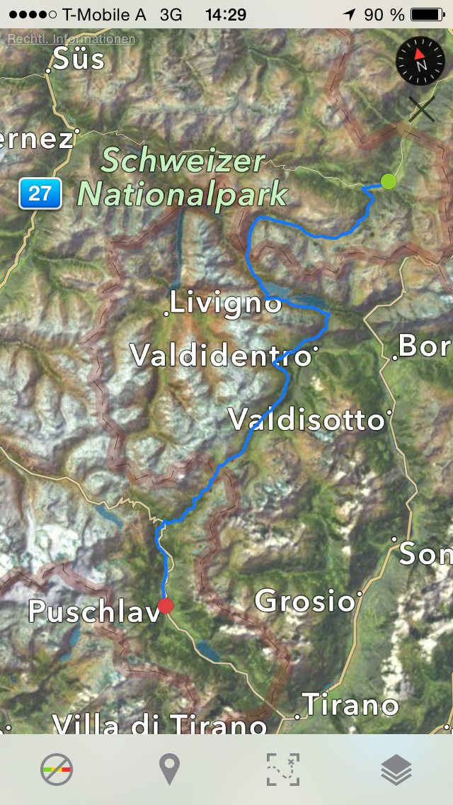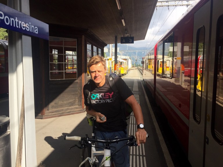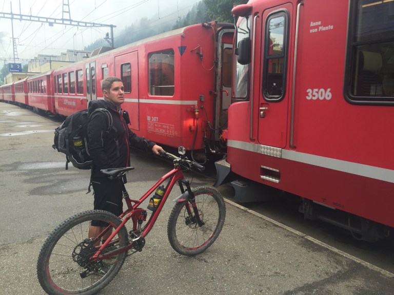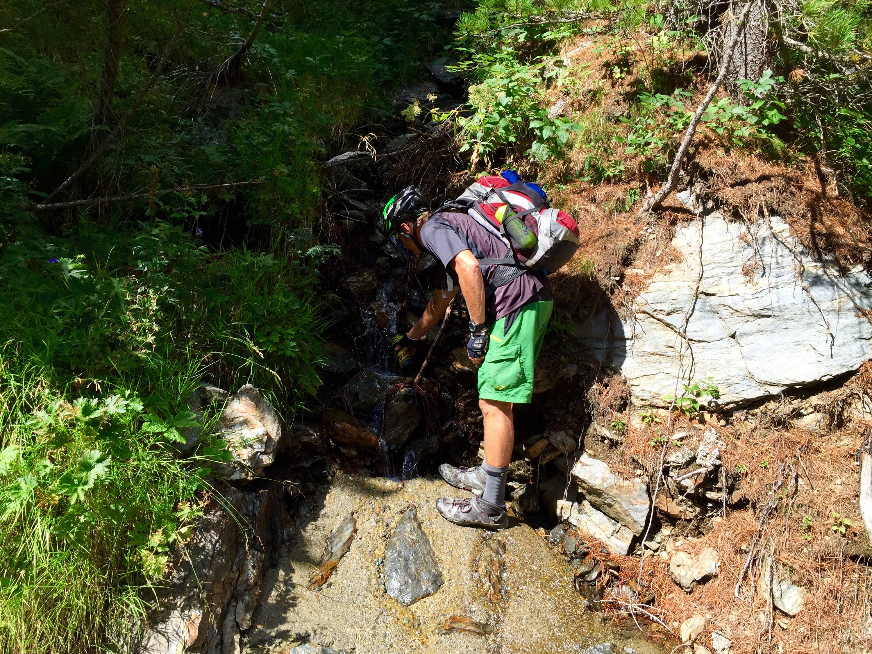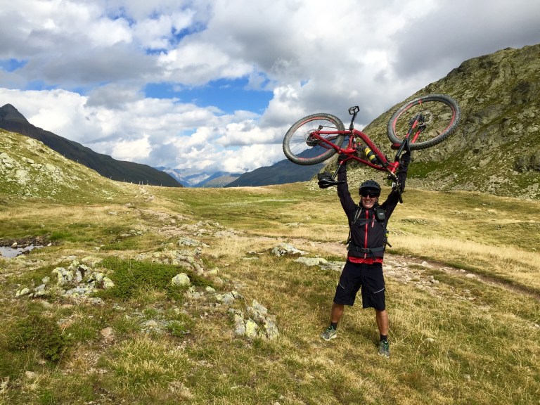 Jetzt mal keine direkte Abfahrt, sondern ein 45 minütiger steiler Abstieg durch die Flanke. Auch eine Erfahrung, besonders mit dem Rad. Dann endlich die rauschende Abfahrt nach Poschiavo unter drohender Wolkenkullisse, die sich aufgebaut hatte. Aber wir hatten weiter Glück und blieben trocken und konnten die unbeschreibliche ‚Achterbahnabfahrt‘ über Hochalmen in unseren Zielort genießen.
