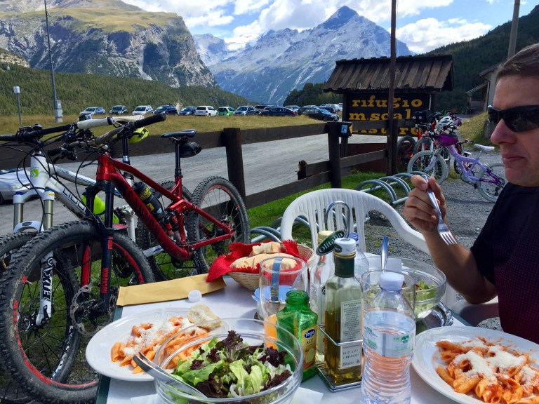 Und natürlich die Liegestühle, Pasta und Grüner Salat am Rifugio die Fraele. Blauer Himmel über uns. Eine Wohltat.